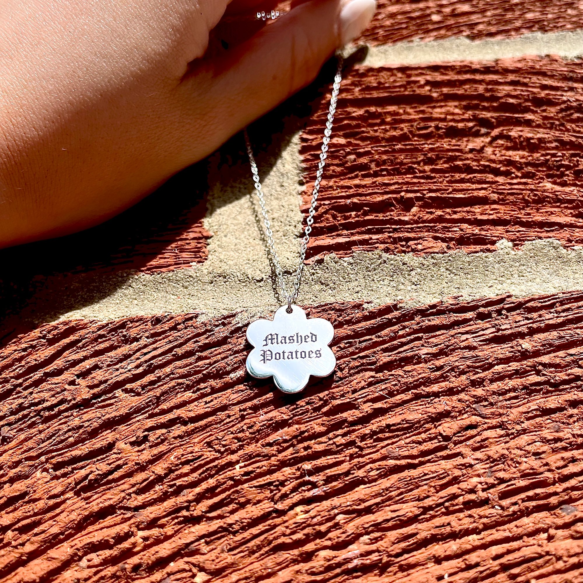 925 Sterling Silver 15mm pendant on an 18" trace chain chain engraved with the gorgeous words Mashed Potatoes